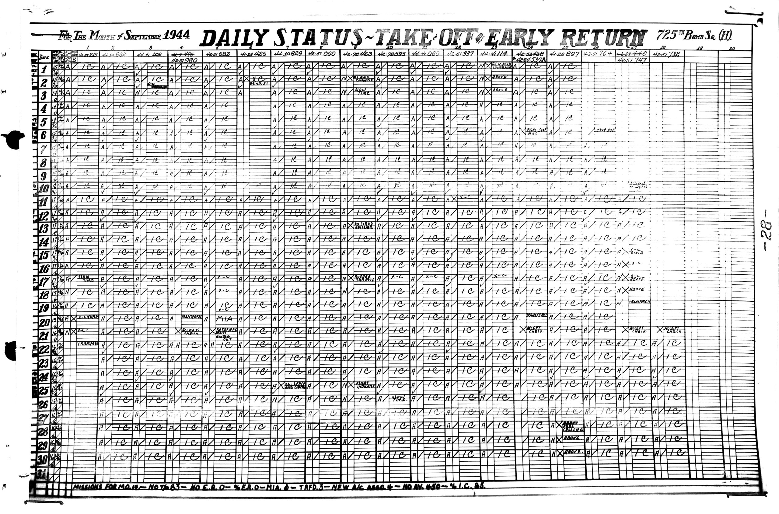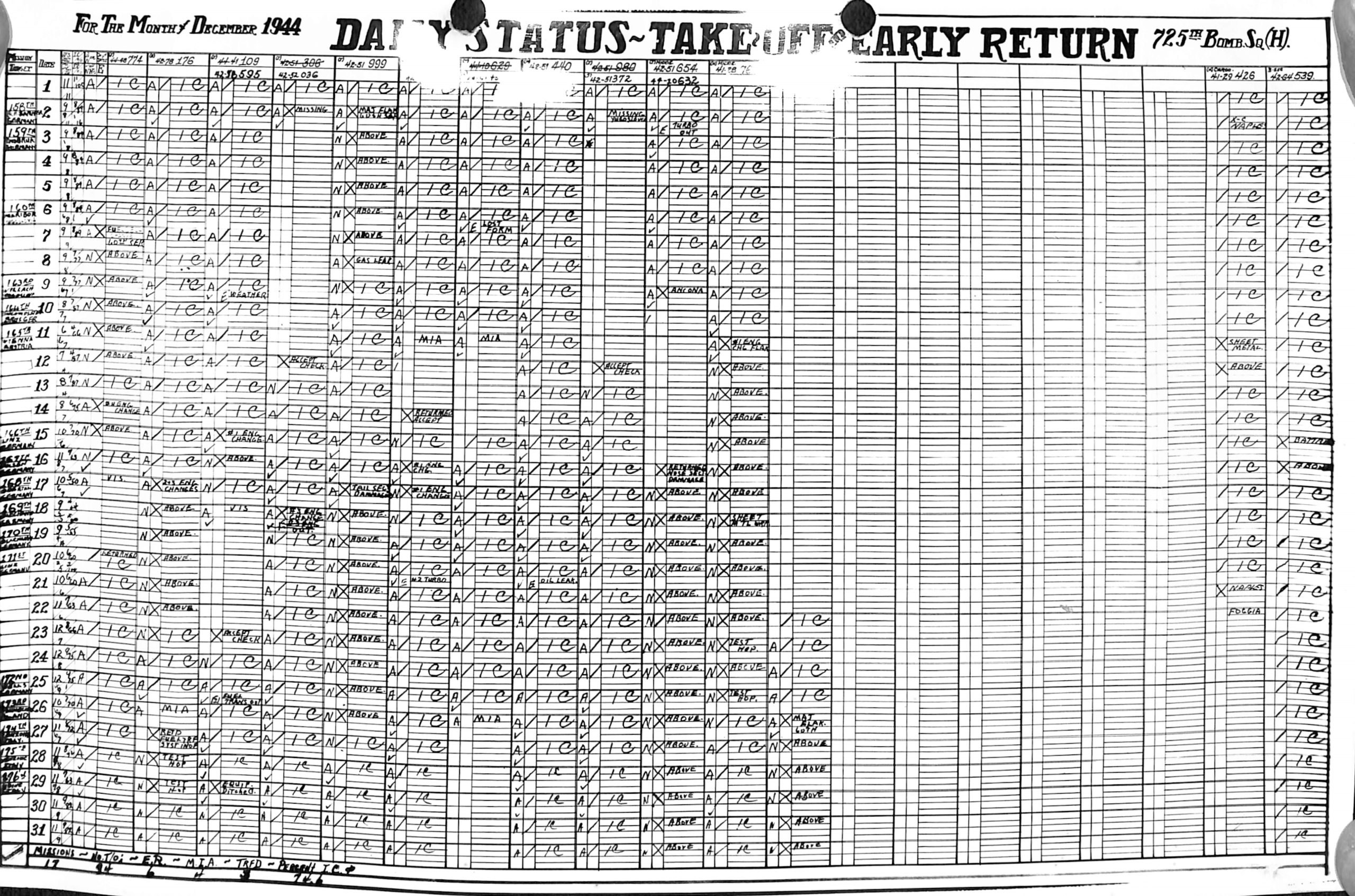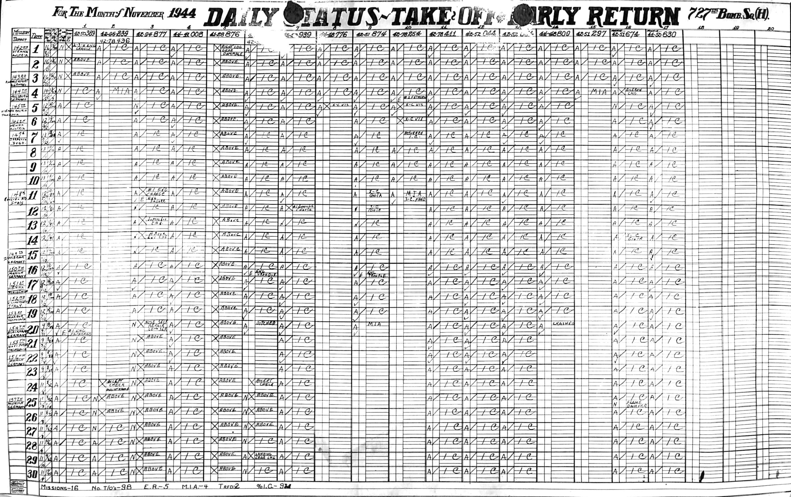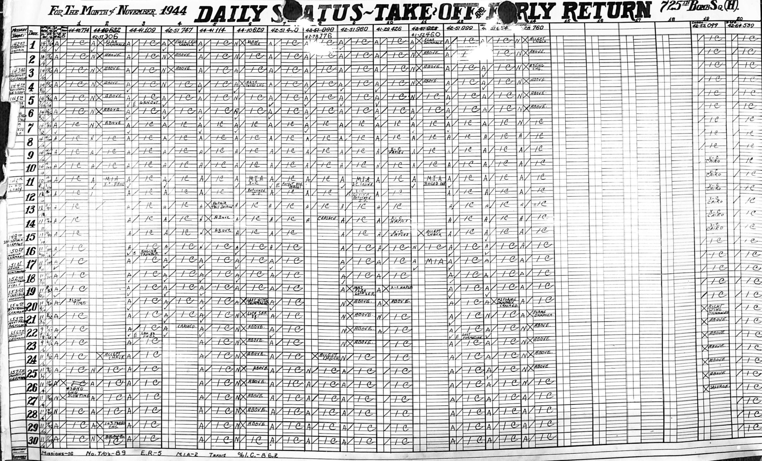 Lists by squadron and month, and details the plane serial number associated with each mission date.