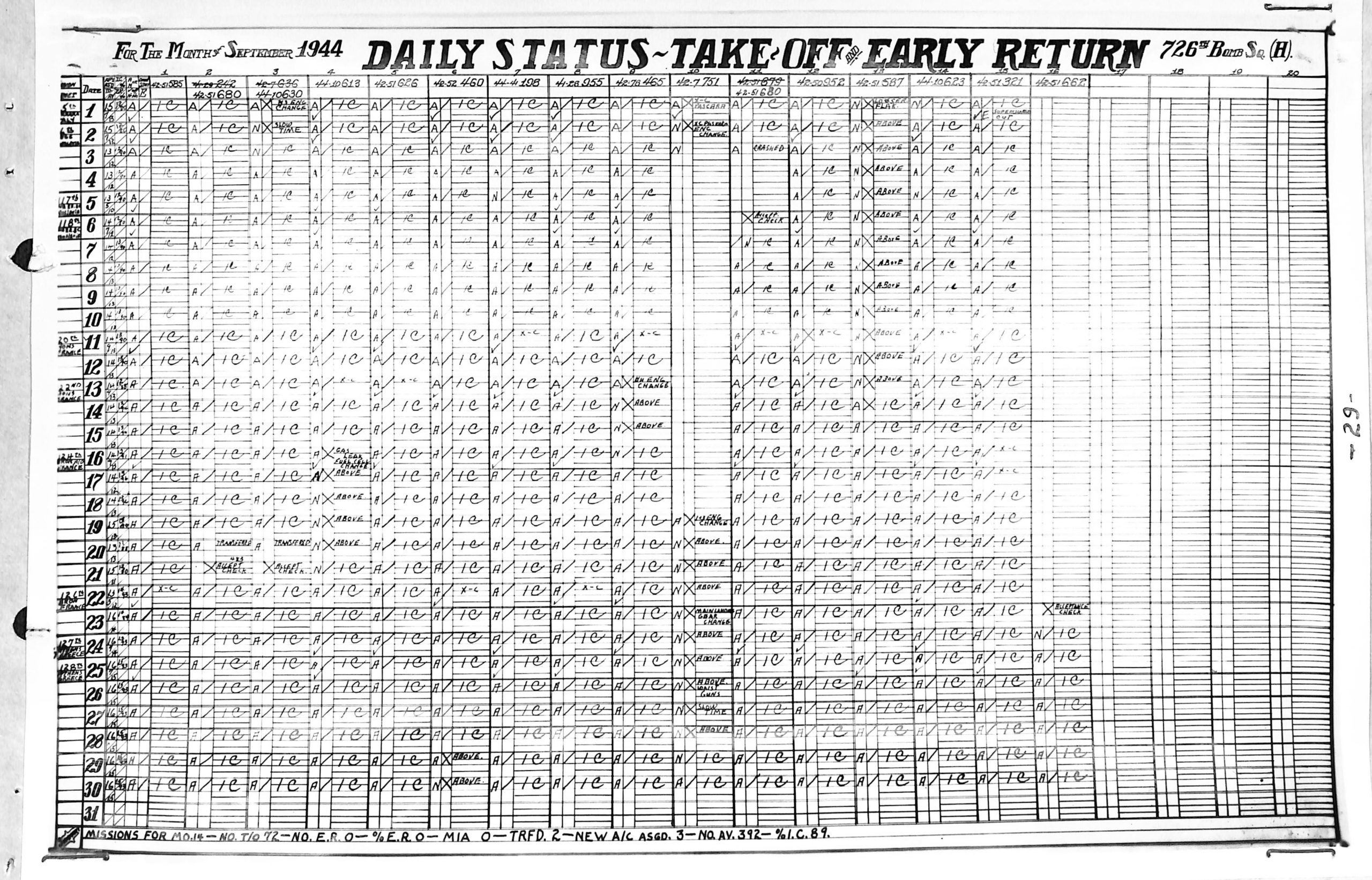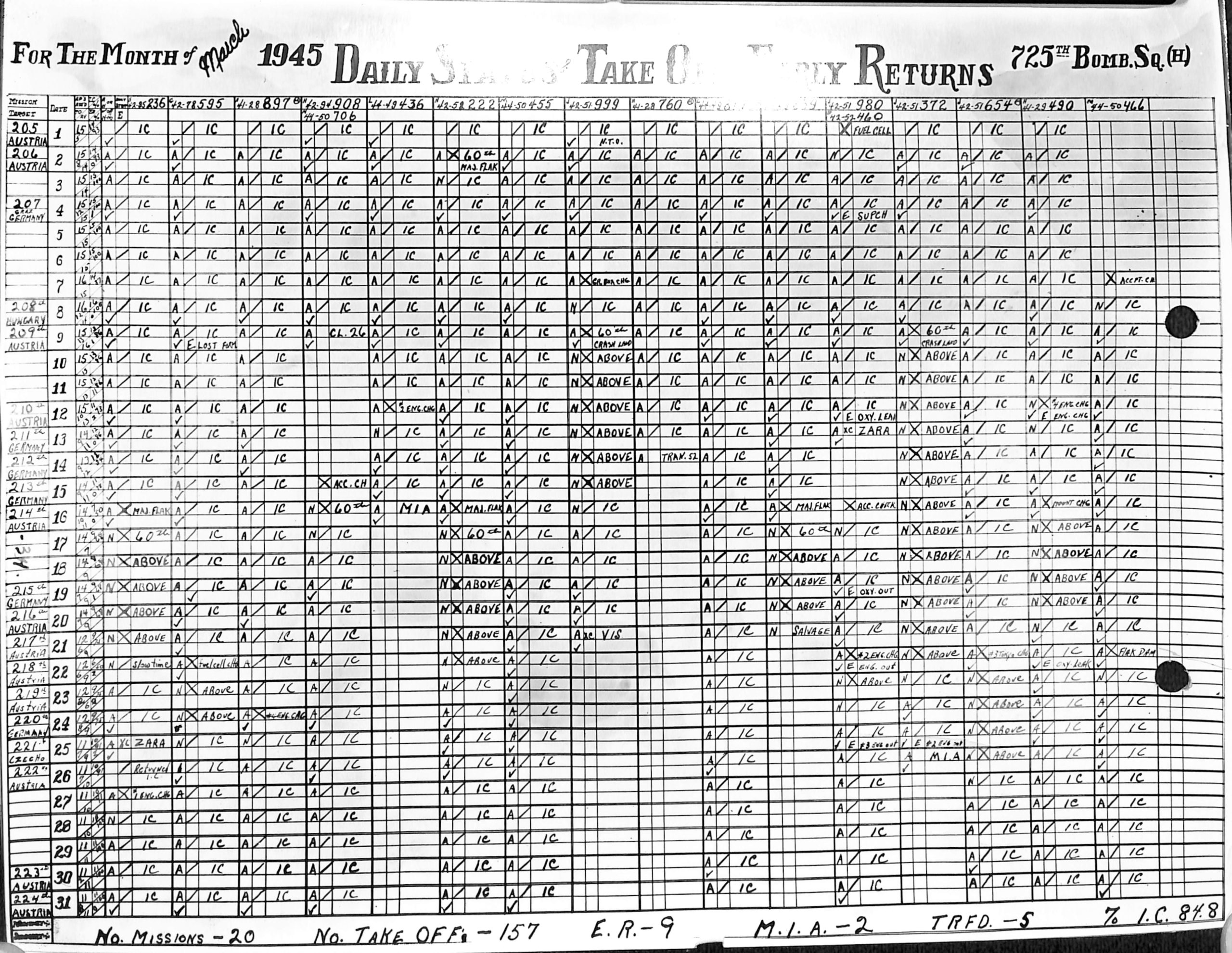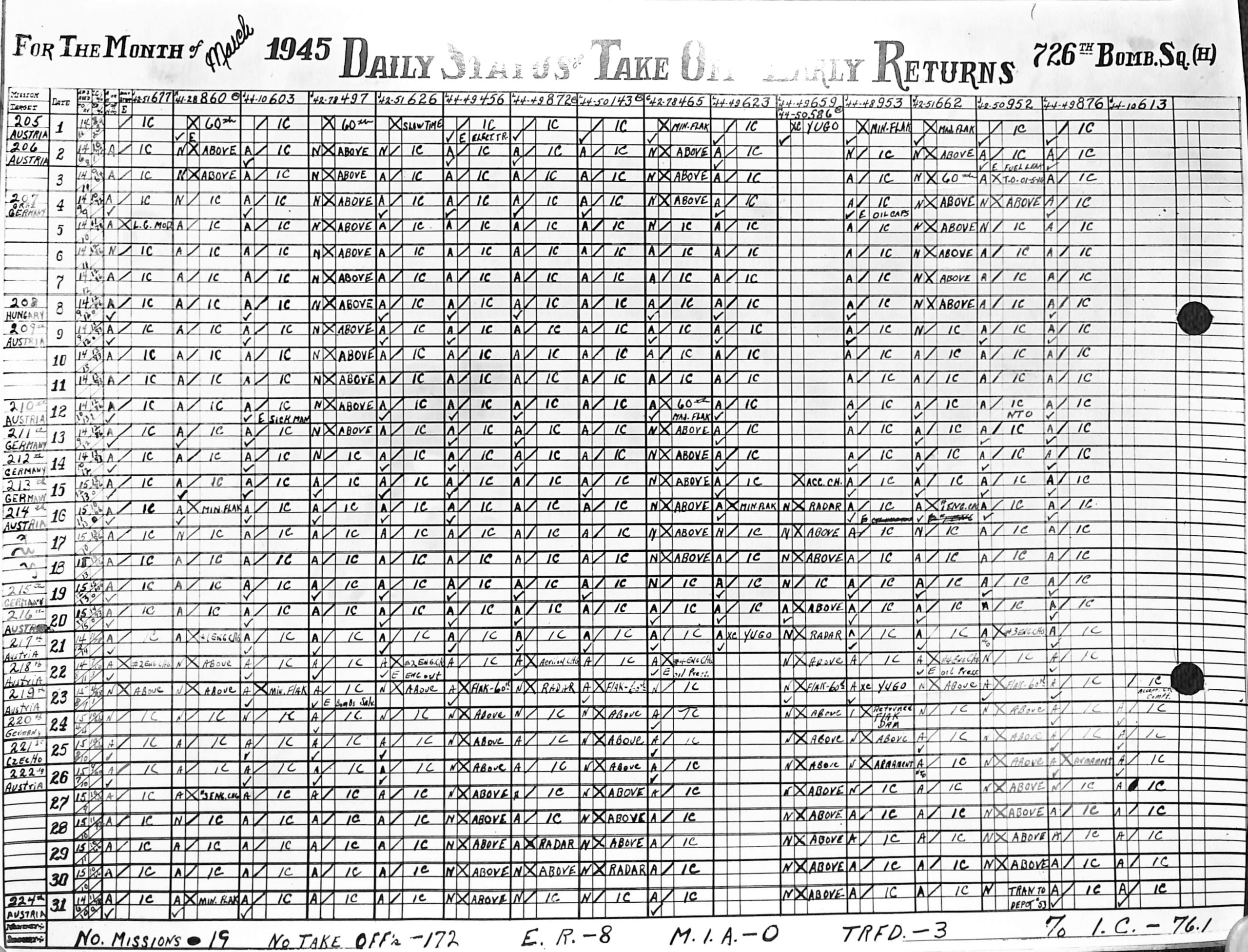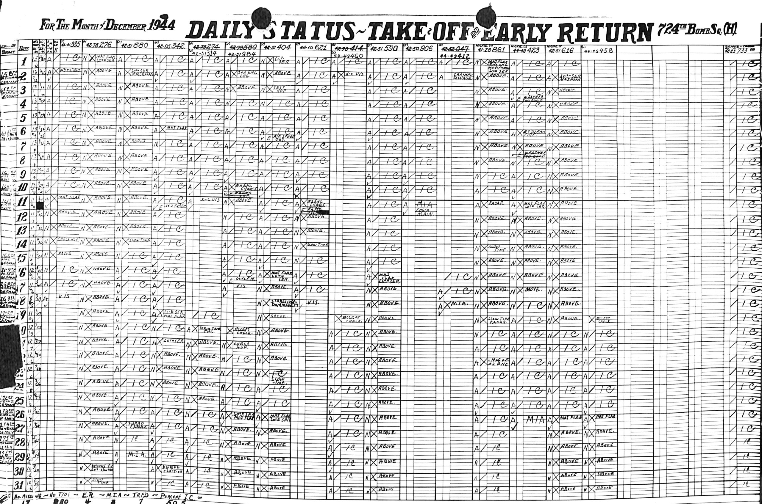 Lists by squadron and month, and details the plane serial number associated with each mission date.