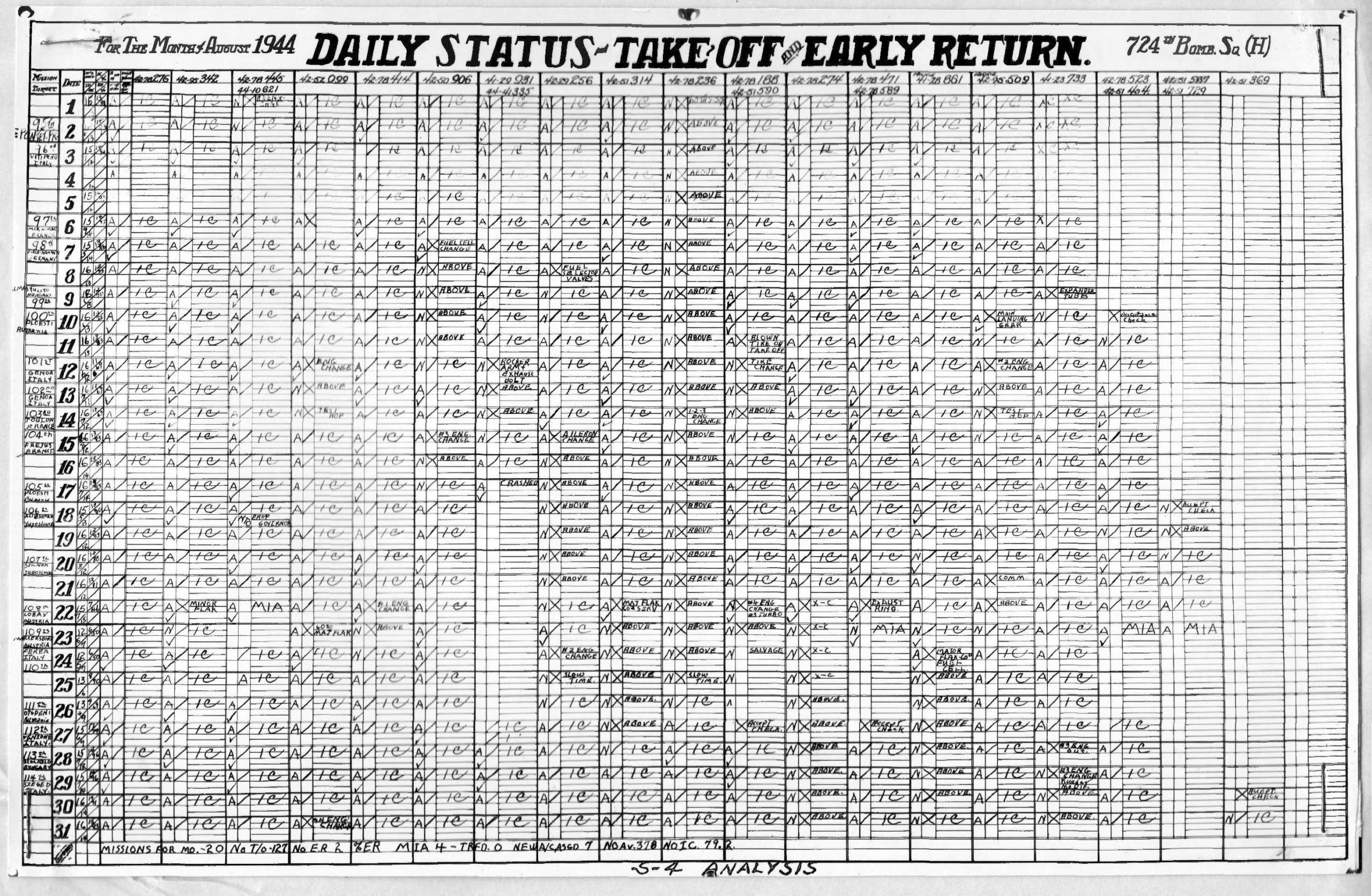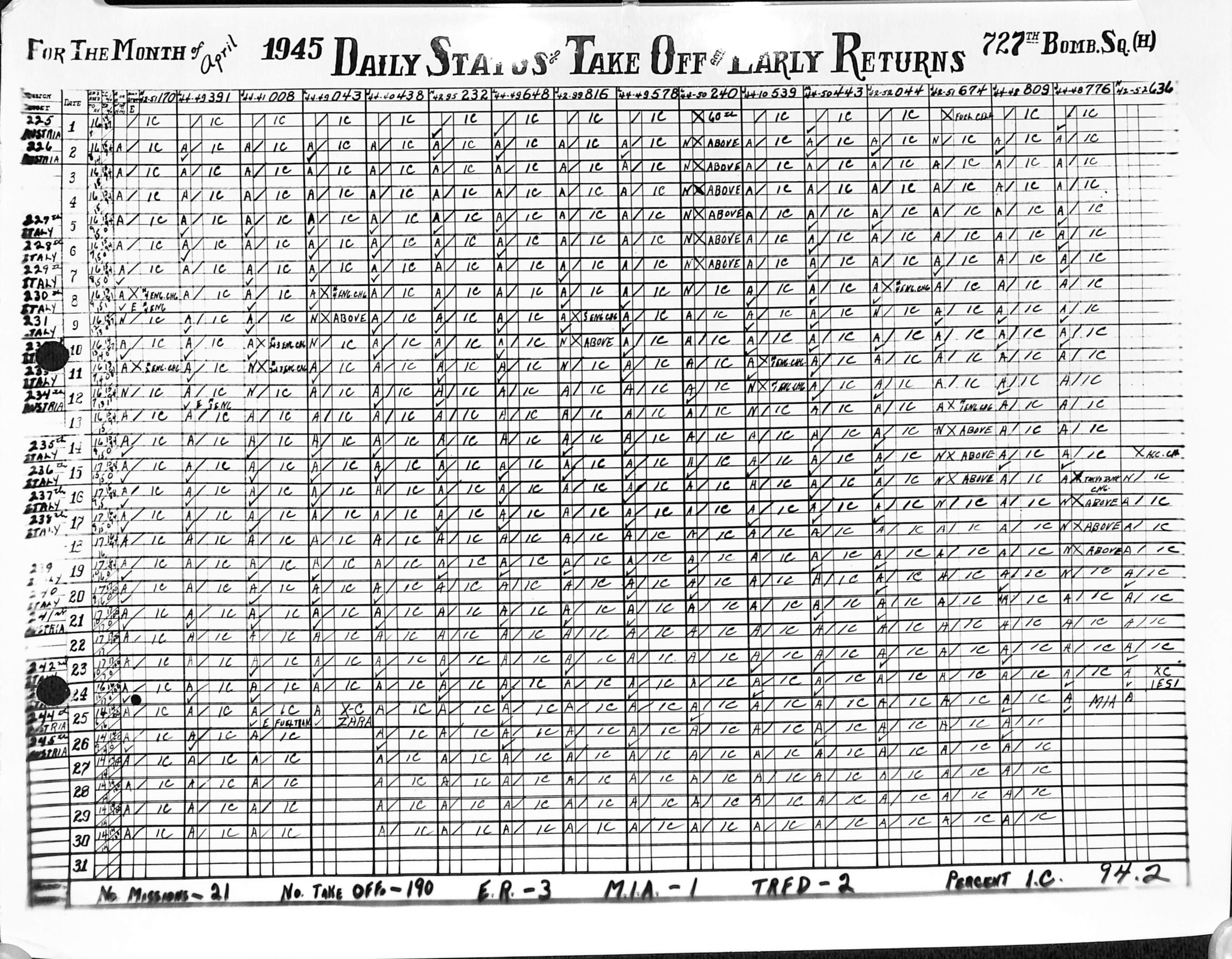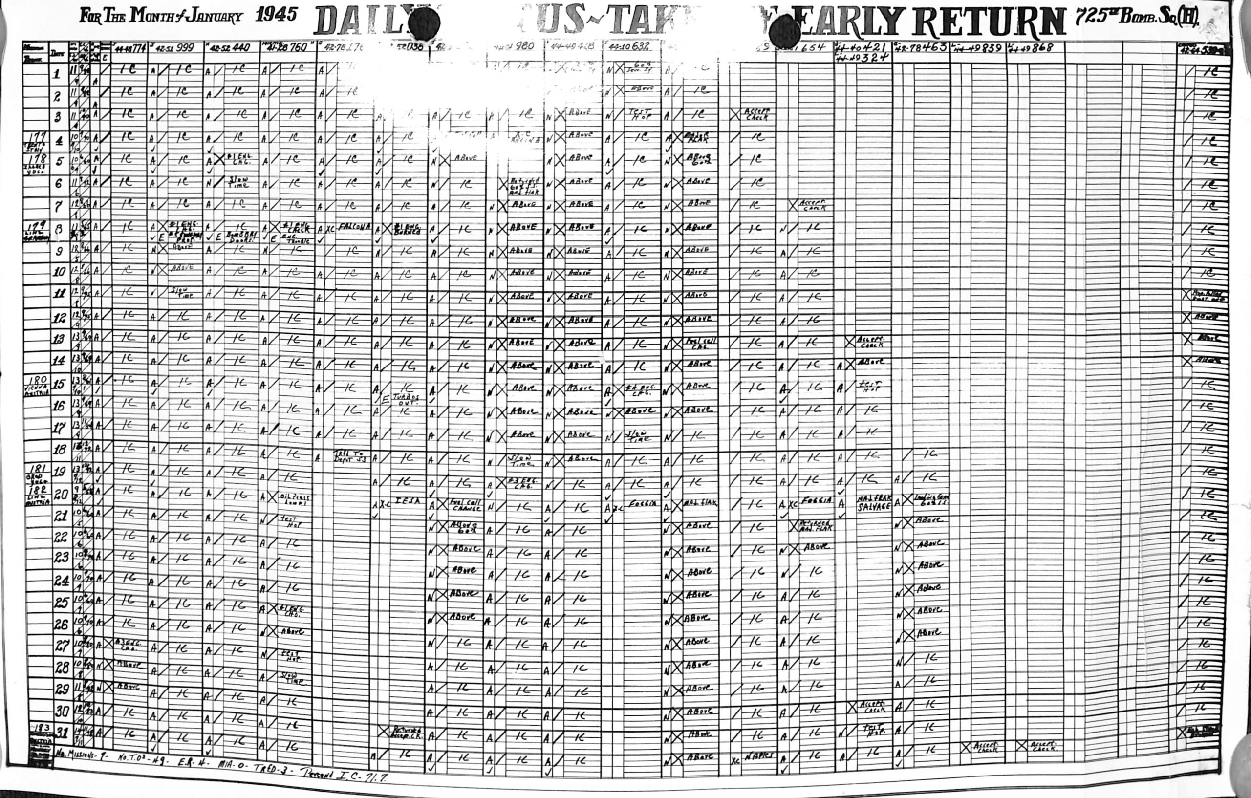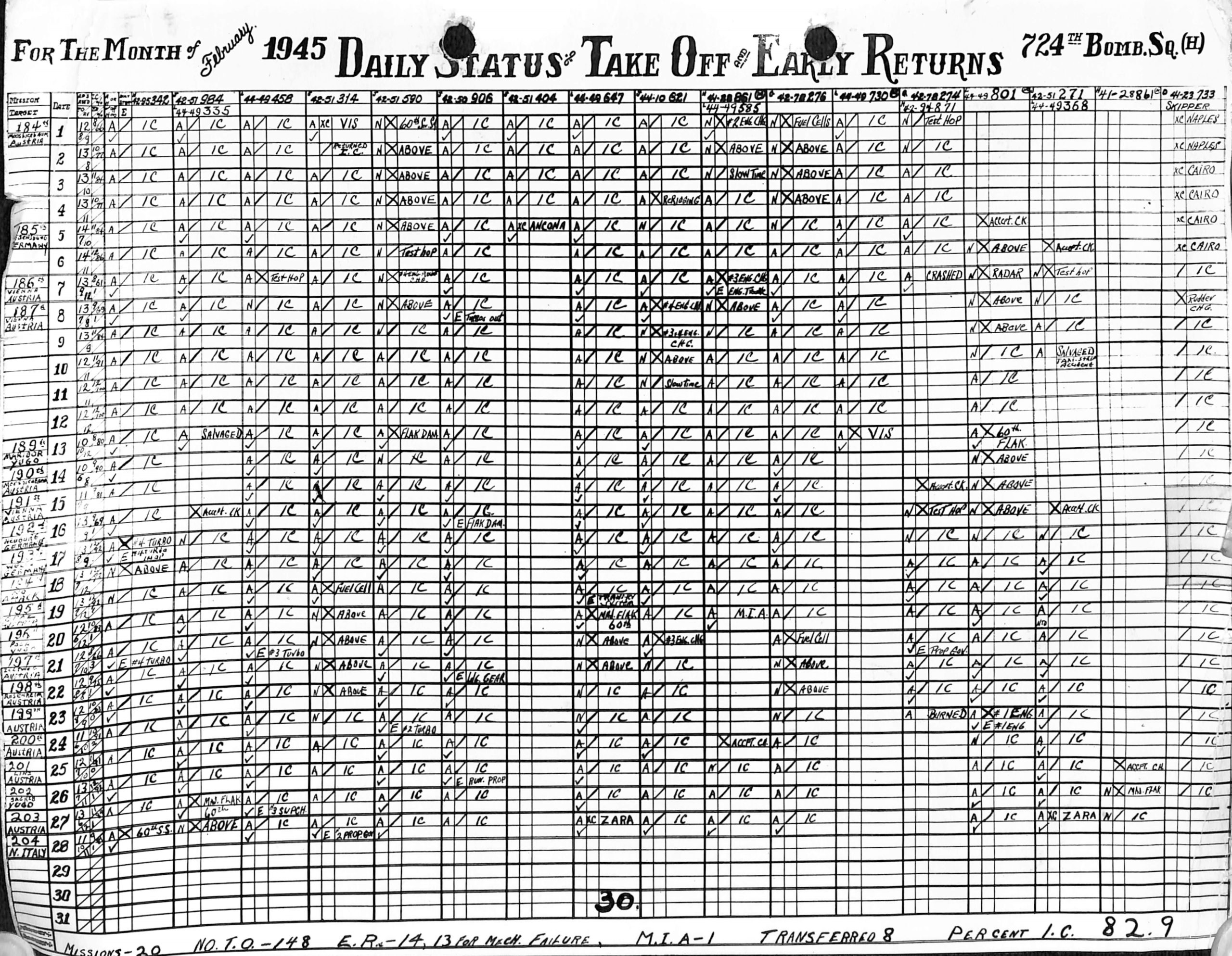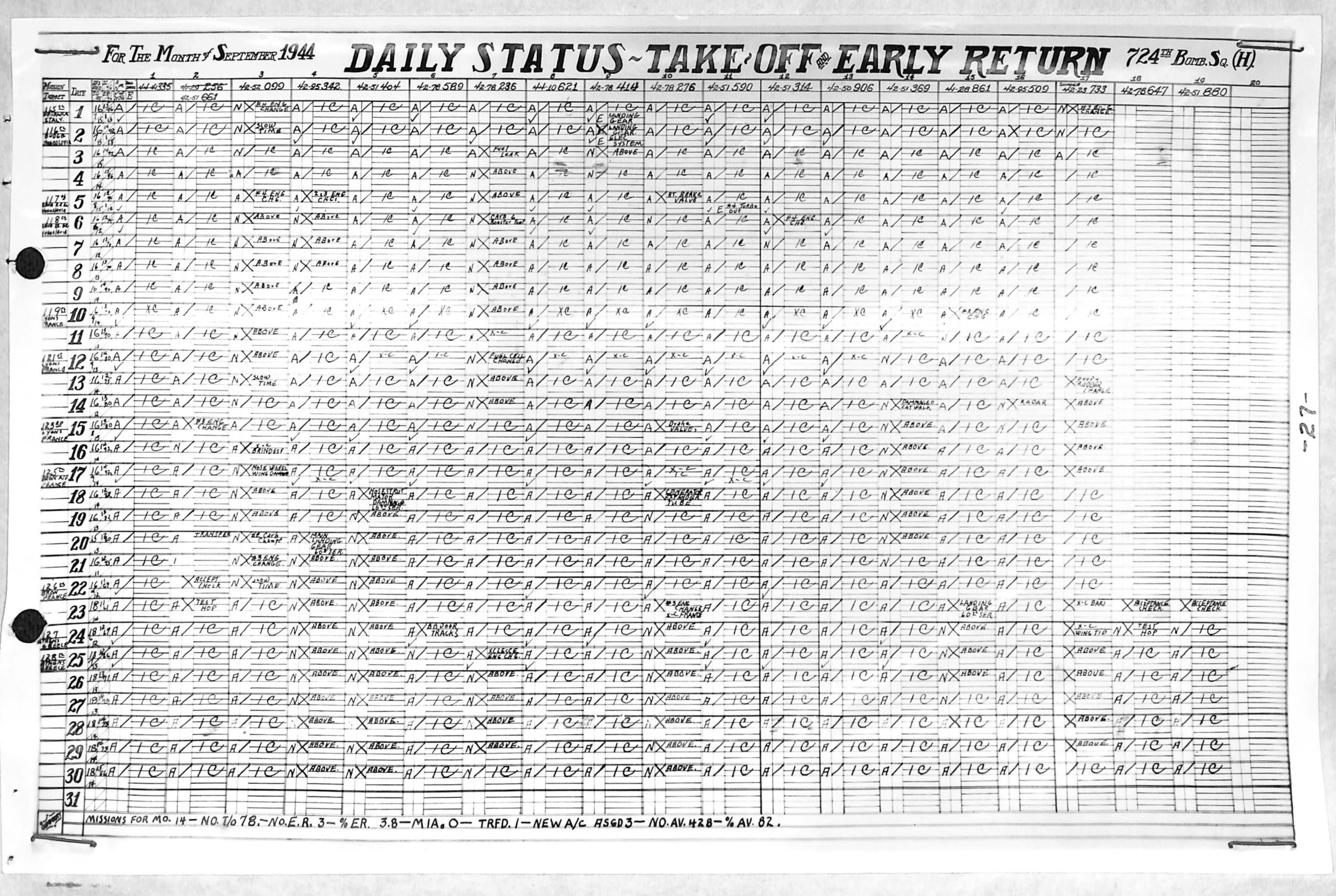 Lists by squadron and month, and details the plane serial number associated with each mission date.