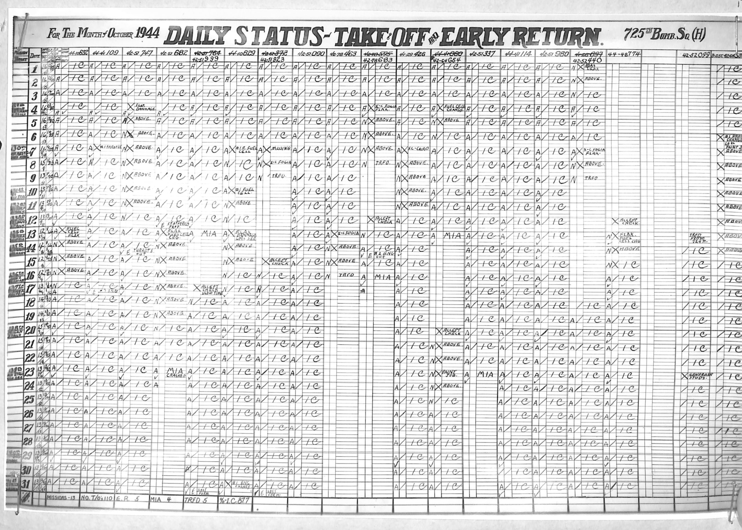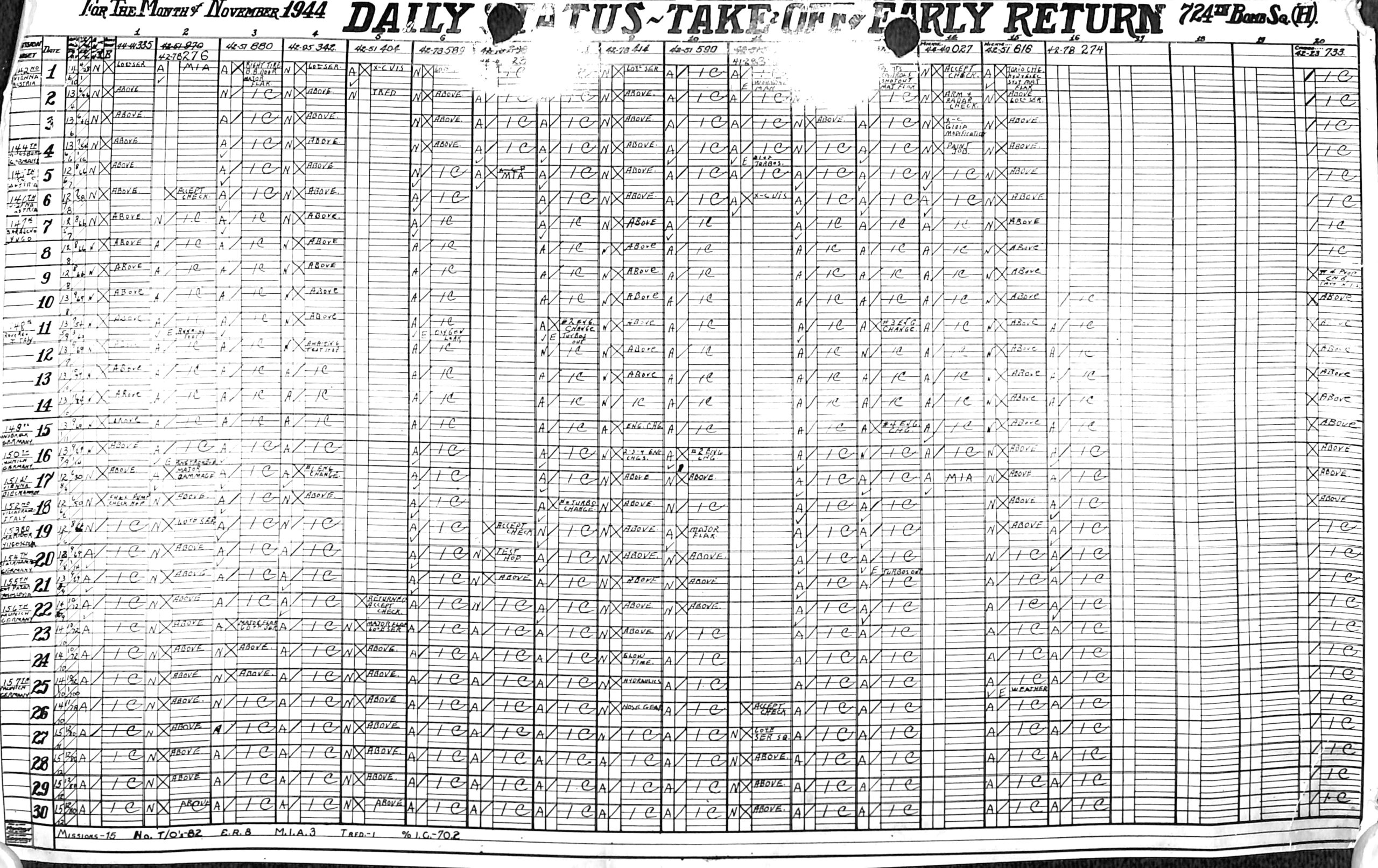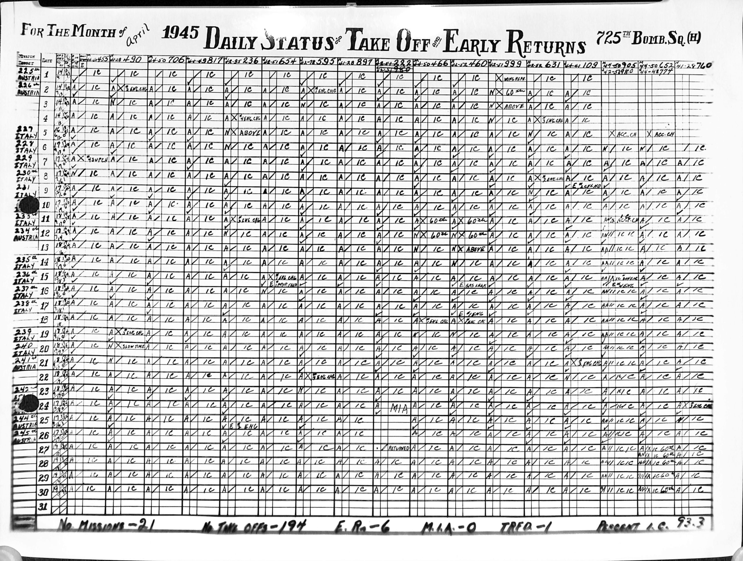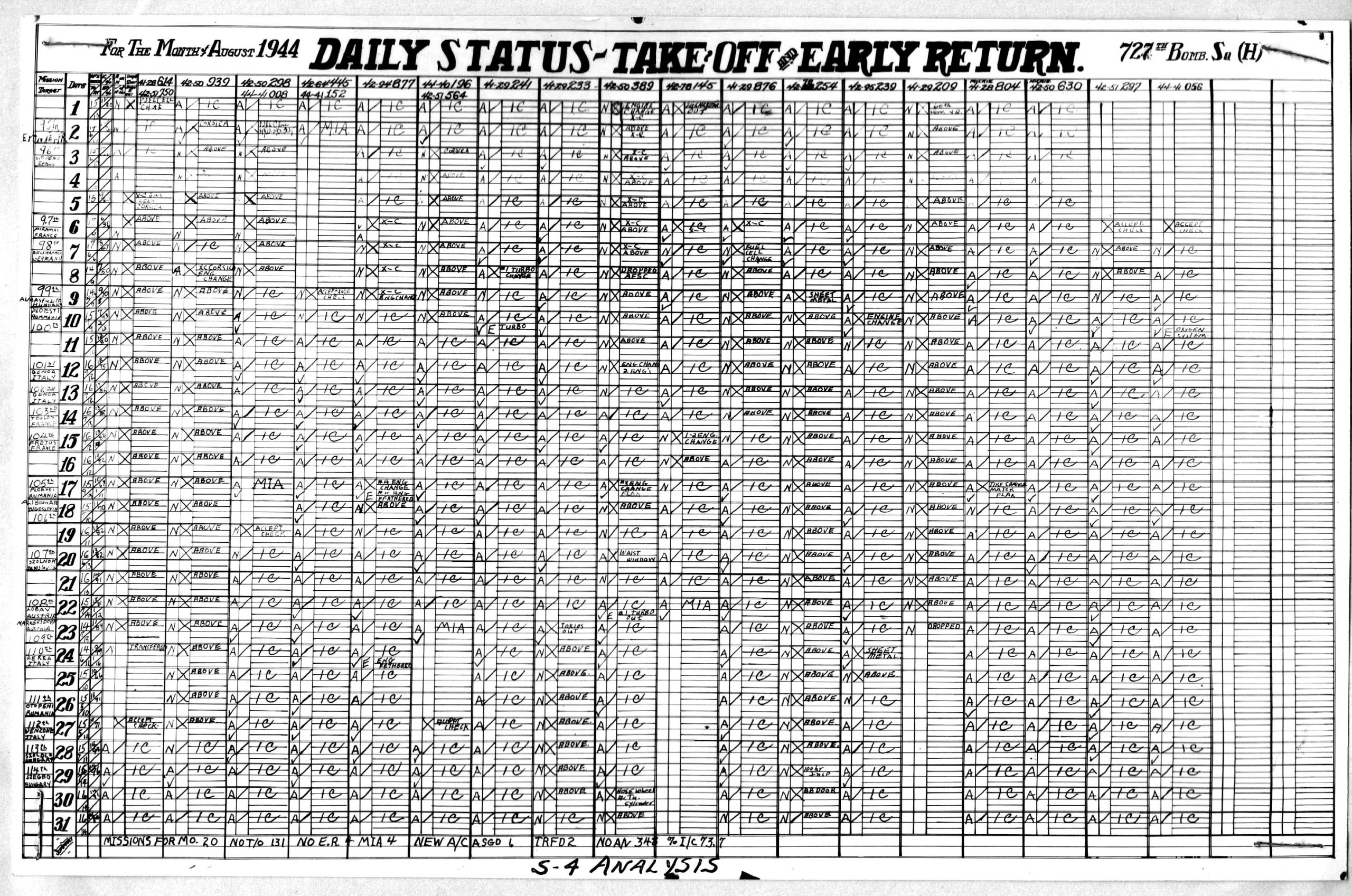 Lists by squadron and month, and details the plane serial number associated with each mission date.