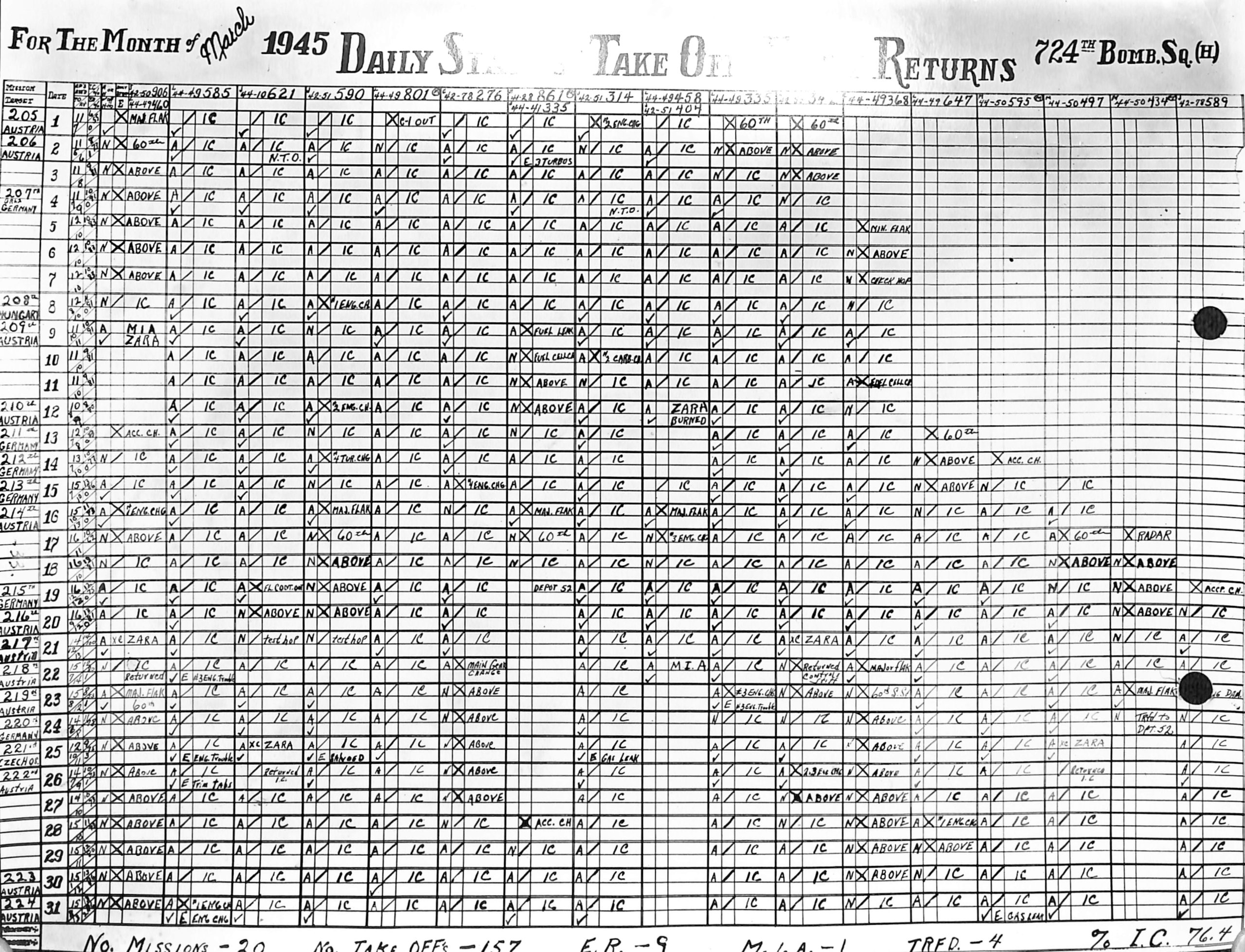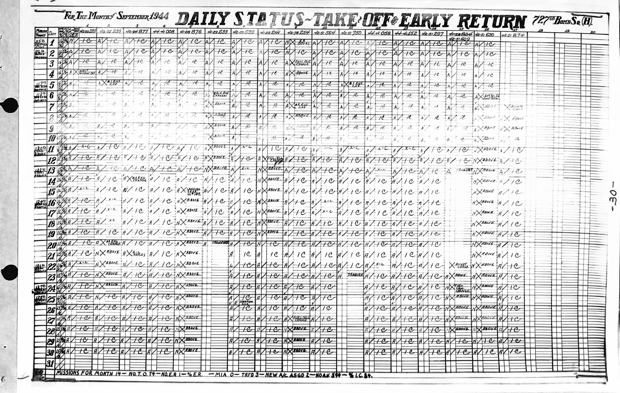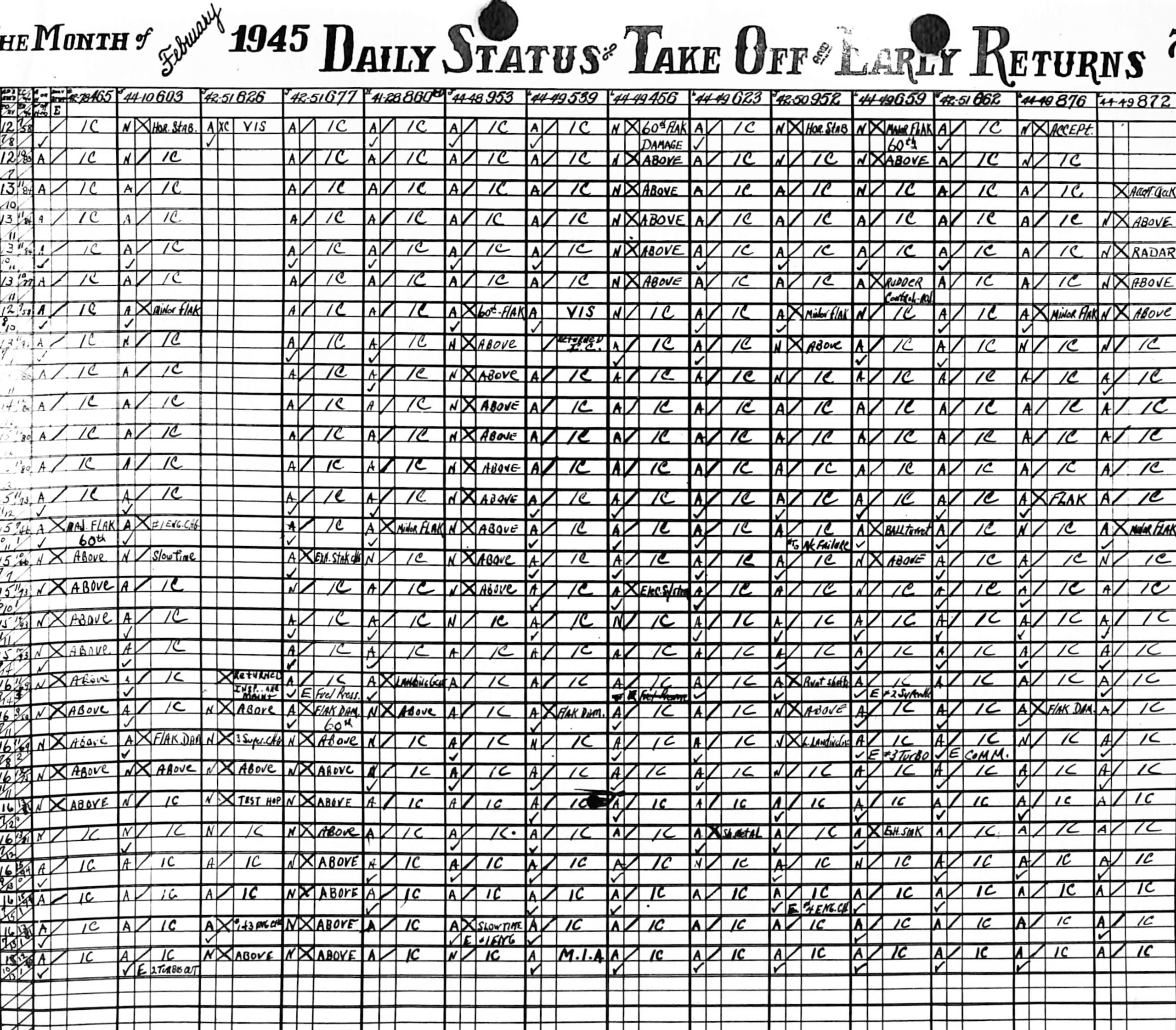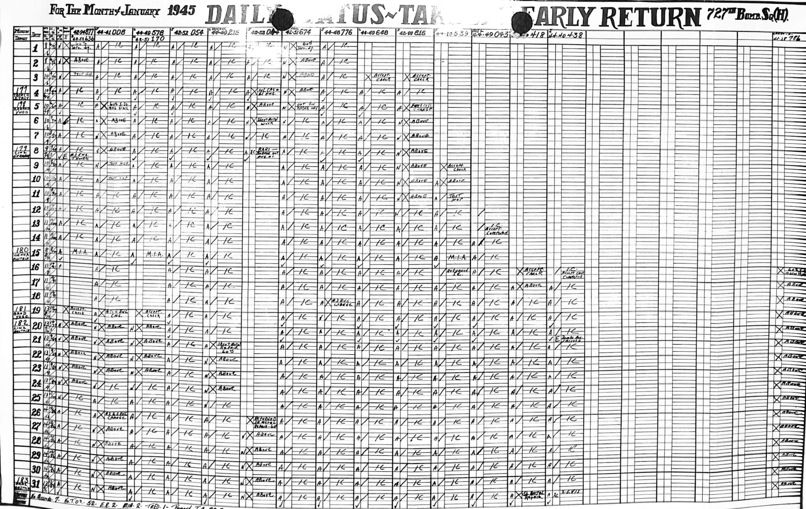 Lists by squadron and month, and details the plane serial number associated with each mission date.